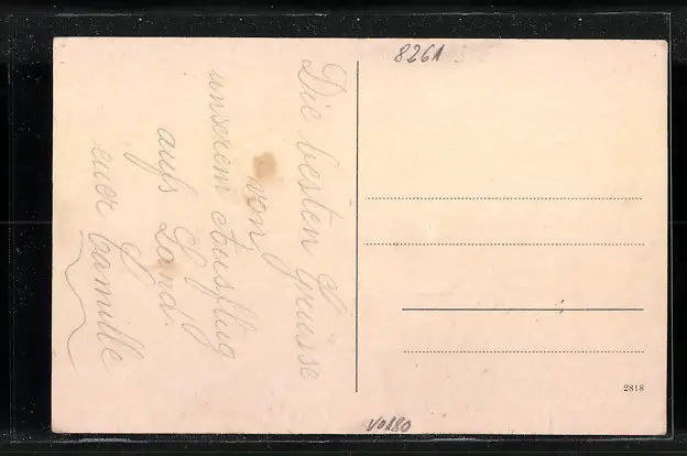 Personenbezogene Daten auf der Rückseite der Karte wurden durch blauen Textmarker unkenntlich gemacht. Die blauen Stellen sind auf die Vorderseite durchgeweicht und wirken sich negativ auf das Postkartenfoto aus