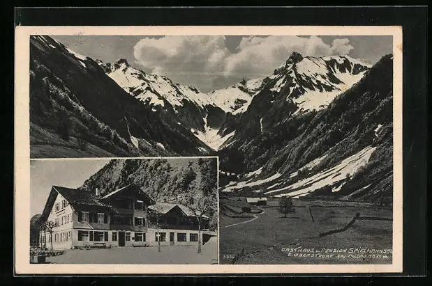 AK Oberstdorf / Allgäu, Gasthaus-Pension Spielmannsau, Gebirgspanorama