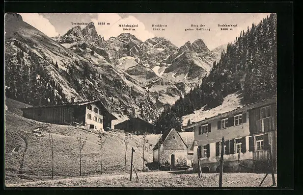 AK Oberstdorf, Einödsbach mit Blick auf Mädelegabel, Hochfrott und Trettachspitze