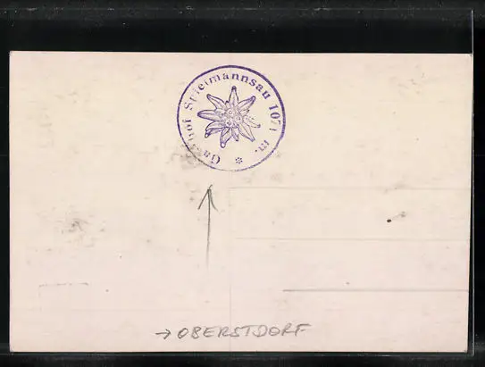 Personenbezogene Daten auf der Rückseite der Karte wurden durch blauen Textmarker unkenntlich gemacht. Die blauen Stellen sind auf die Vorderseite durchgeweicht und wirken sich negativ auf das Postkartenfoto aus