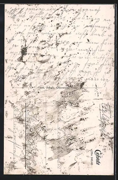 Personenbezogene Daten auf der Rückseite der Karte wurden durch blauen Textmarker unkenntlich gemacht. Die blauen Stellen sind auf die Vorderseite durchgeweicht und wirken sich negativ auf das Postkartenfoto aus