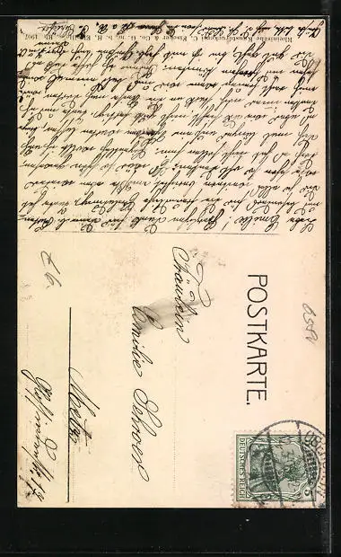 Personenbezogene Daten auf der Rückseite der Karte wurden durch blauen Textmarker unkenntlich gemacht. Die blauen Stellen sind auf die Vorderseite durchgeweicht und wirken sich negativ auf das Postkartenfoto aus