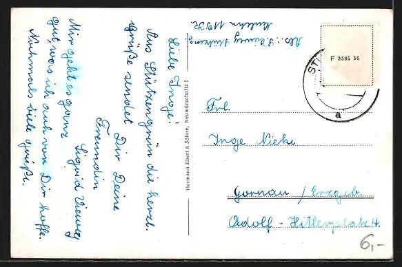 Personenbezogene Daten auf der Rückseite der Karte wurden durch blauen Textmarker unkenntlich gemacht. Die blauen Stellen sind auf die Vorderseite durchgeweicht und wirken sich negativ auf das Postkartenfoto aus