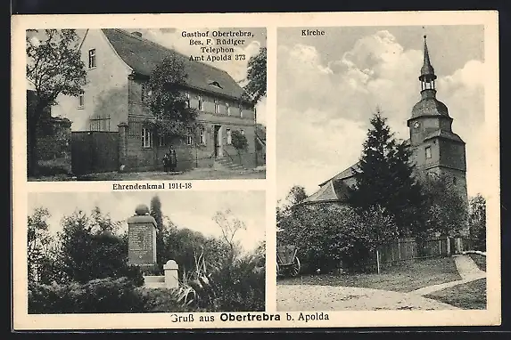 AK Obertrebra bei Apolda, Gasthof F. Rüdiger, Ehrendenkmal 1914-18, Kirche
