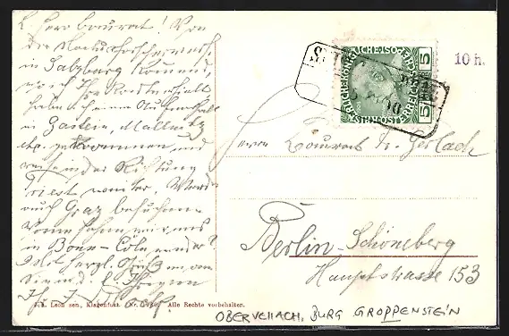 Personenbezogene Daten auf der Rückseite der Karte wurden durch blauen Textmarker unkenntlich gemacht. Die blauen Stellen sind auf die Vorderseite durchgeweicht und wirken sich negativ auf das Postkartenfoto aus