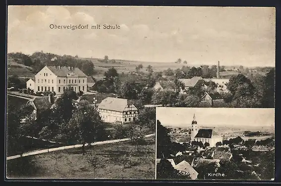 AK Oberweigsdorf, Ortsansicht mit Schule, Blick auf die Kirche