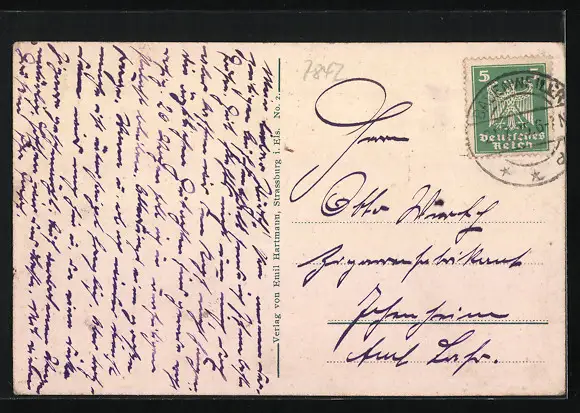 Personenbezogene Daten auf der Rückseite der Karte wurden durch blauen Textmarker unkenntlich gemacht. Die blauen Stellen sind auf die Vorderseite durchgeweicht und wirken sich negativ auf das Postkartenfoto aus