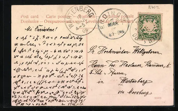 Personenbezogene Daten auf der Rückseite der Karte wurden durch blauen Textmarker unkenntlich gemacht. Die blauen Stellen sind auf die Vorderseite durchgeweicht und wirken sich negativ auf das Postkartenfoto aus