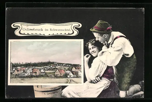 AK Ochenbruck i. Schwarzachtal, Ortsansicht, Paar in Tracht