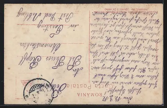 Personenbezogene Daten auf der Rückseite der Karte wurden durch blauen Textmarker unkenntlich gemacht. Die blauen Stellen sind auf die Vorderseite durchgeweicht und wirken sich negativ auf das Postkartenfoto aus