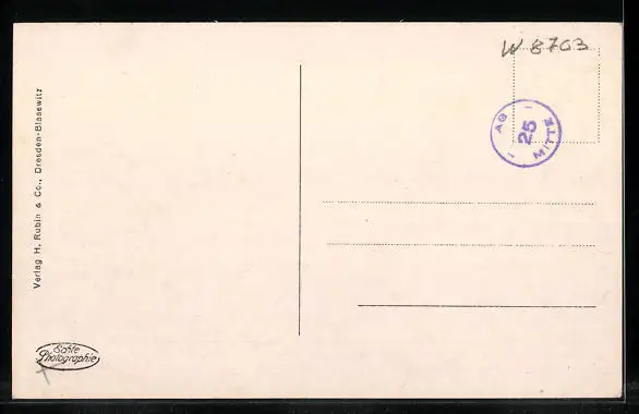 Personenbezogene Daten auf der Rückseite der Karte wurden durch blauen Textmarker unkenntlich gemacht. Die blauen Stellen sind auf die Vorderseite durchgeweicht und wirken sich negativ auf das Postkartenfoto aus