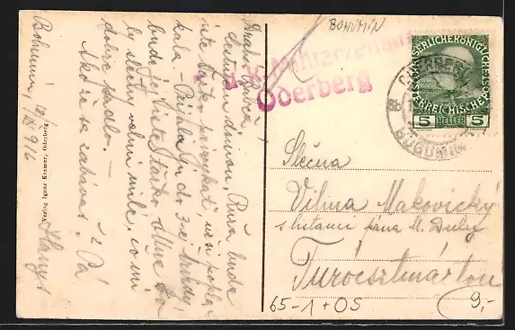 Personenbezogene Daten auf der Rückseite der Karte wurden durch blauen Textmarker unkenntlich gemacht. Die blauen Stellen sind auf die Vorderseite durchgeweicht und wirken sich negativ auf das Postkartenfoto aus