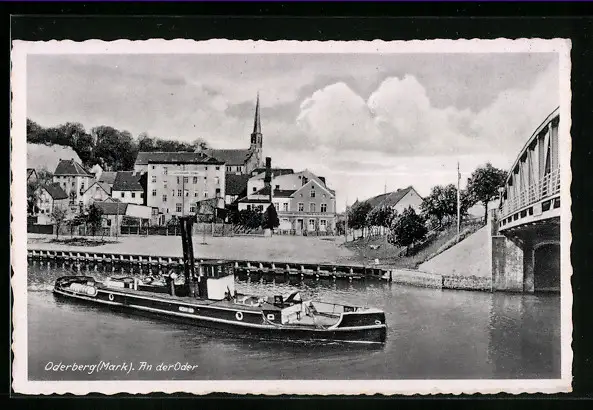 AK Oderberg Mark, kleiner Dampfer am Oderufer, Blick zur Kirche