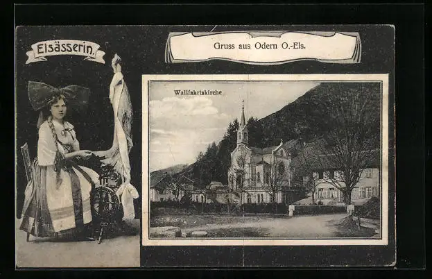 AK Odern O.-Els., Ortsansicht mit Wallfahrtskirche, Elsässerin in Tracht