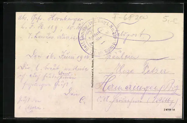 Personenbezogene Daten auf der Rückseite der Karte wurden durch blauen Textmarker unkenntlich gemacht. Die blauen Stellen sind auf die Vorderseite durchgeweicht und wirken sich negativ auf das Postkartenfoto aus