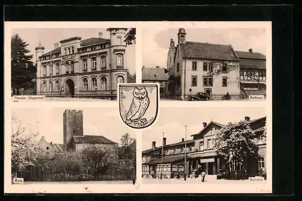 AK Oebisfelde, Theater (Jägerhof), Rathaus, Burg, Bahnhof