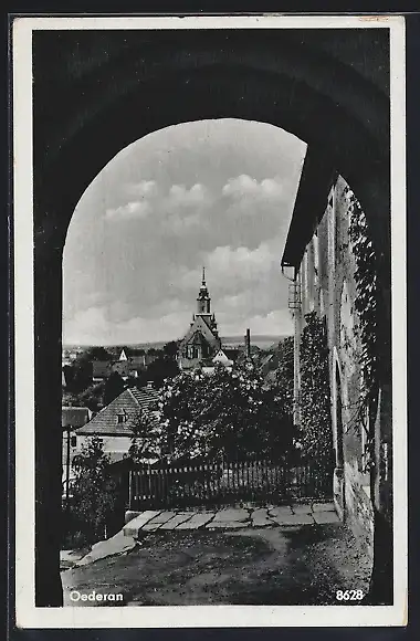 AK Oederan, Ortsansicht durch einen Torbogen