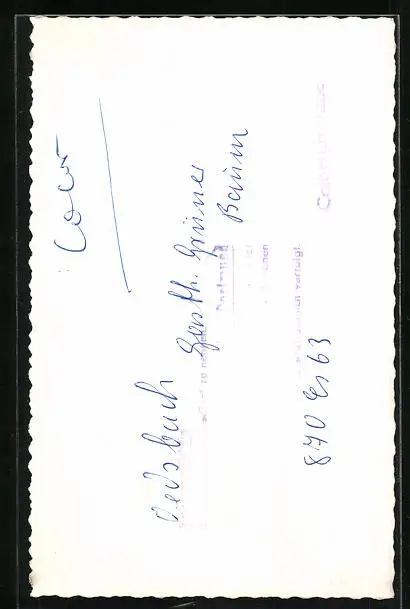 Personenbezogene Daten auf der Rückseite der Karte wurden durch blauen Textmarker unkenntlich gemacht. Die blauen Stellen sind auf die Vorderseite durchgeweicht und wirken sich negativ auf das Postkartenfoto aus
