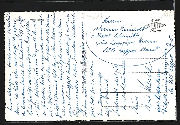 Personenbezogene Daten auf der Rückseite der Karte wurden durch blauen Textmarker unkenntlich gemacht. Die blauen Stellen sind auf die Vorderseite durchgeweicht und wirken sich negativ auf das Postkartenfoto aus