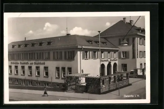 AK Oelsnitz i. V., Strassenpartie an der Stadtbank Sparkasse