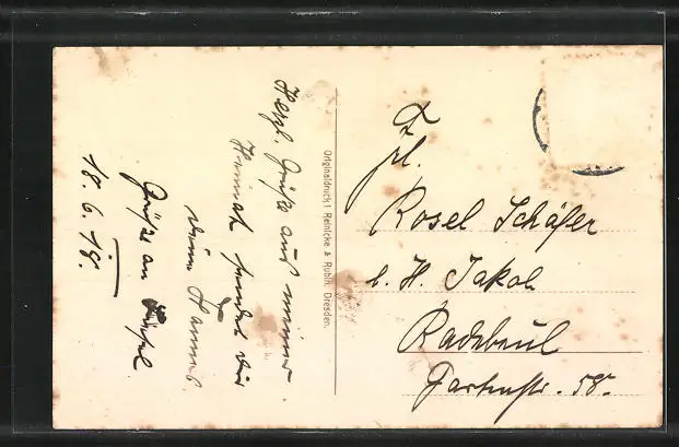 Personenbezogene Daten auf der Rückseite der Karte wurden durch blauen Textmarker unkenntlich gemacht. Die blauen Stellen sind auf die Vorderseite durchgeweicht und wirken sich negativ auf das Postkartenfoto aus