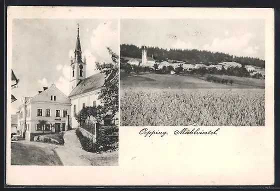 AK Oepping, Geschäft und Kirche im Mühlviertel, Teilansicht