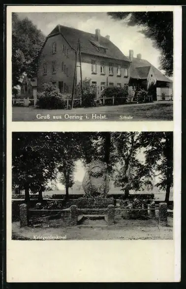 AK Oering i. Holst., Strassenpartie an der Schule, Kriegerdenkmal