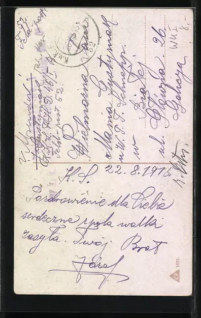 Personenbezogene Daten auf der Rückseite der Karte wurden durch blauen Textmarker unkenntlich gemacht. Die blauen Stellen sind auf die Vorderseite durchgeweicht und wirken sich negativ auf das Postkartenfoto aus