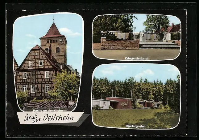 AK Oetisheim, Partie an der Kirche, Kriegerdenkmal, Kindergarten