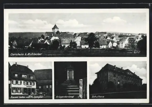 AK Oetisheim b. Mühlacker, Kronen-Laden v. Fr. Spingler, Schulhaus, Panorama