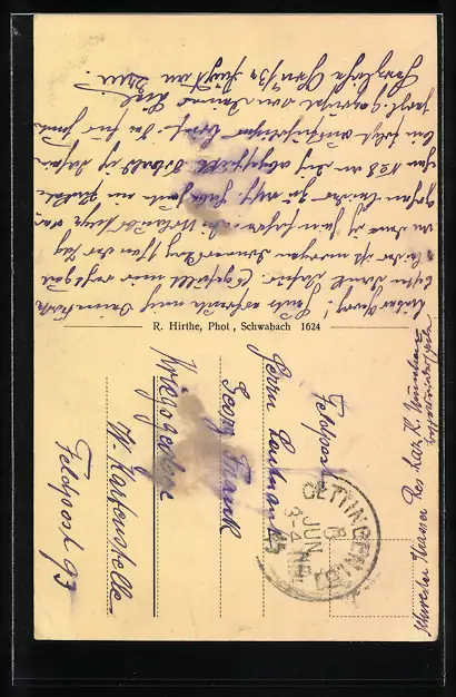 Personenbezogene Daten auf der Rückseite der Karte wurden durch blauen Textmarker unkenntlich gemacht. Die blauen Stellen sind auf die Vorderseite durchgeweicht und wirken sich negativ auf das Postkartenfoto aus