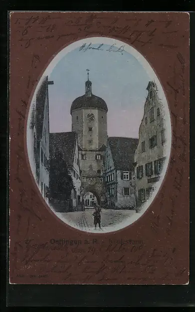 Personenbezogene Daten auf der Rückseite der Karte wurden durch blauen Textmarker unkenntlich gemacht. Die blauen Stellen sind auf die Vorderseite durchgeweicht und wirken sich negativ auf das Postkartenfoto aus