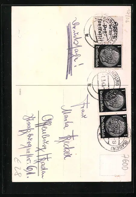 Personenbezogene Daten auf der Rückseite der Karte wurden durch blauen Textmarker unkenntlich gemacht. Die blauen Stellen sind auf die Vorderseite durchgeweicht und wirken sich negativ auf das Postkartenfoto aus