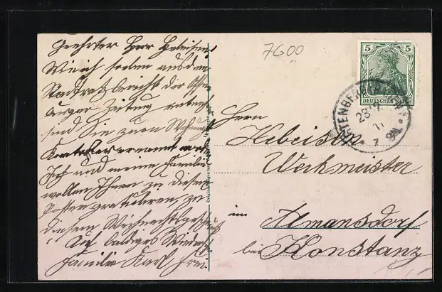 Personenbezogene Daten auf der Rückseite der Karte wurden durch blauen Textmarker unkenntlich gemacht. Die blauen Stellen sind auf die Vorderseite durchgeweicht und wirken sich negativ auf das Postkartenfoto aus