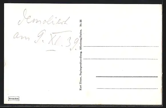 Personenbezogene Daten auf der Rückseite der Karte wurden durch blauen Textmarker unkenntlich gemacht. Die blauen Stellen sind auf die Vorderseite durchgeweicht und wirken sich negativ auf das Postkartenfoto aus
