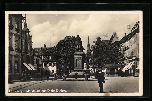 AK Offenburg, Marktplatz m. Blick z. Drake-Denkmal