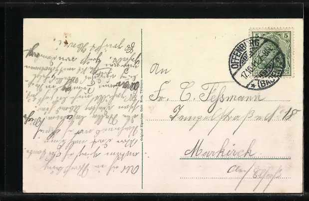Personenbezogene Daten auf der Rückseite der Karte wurden durch blauen Textmarker unkenntlich gemacht. Die blauen Stellen sind auf die Vorderseite durchgeweicht und wirken sich negativ auf das Postkartenfoto aus