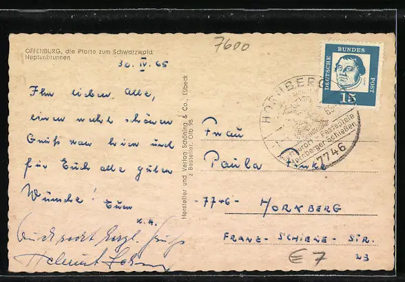 Personenbezogene Daten auf der Rückseite der Karte wurden durch blauen Textmarker unkenntlich gemacht. Die blauen Stellen sind auf die Vorderseite durchgeweicht und wirken sich negativ auf das Postkartenfoto aus