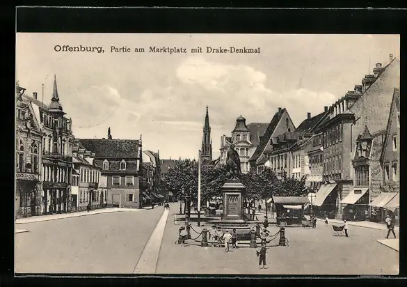 AK Offenburg, Partie am Marktplatz mit Drake-Denkmal