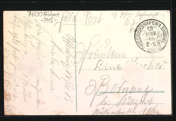 gelaufen 1915 als Feldpost, rückseitig Oberflächenschaden, guter Zustand