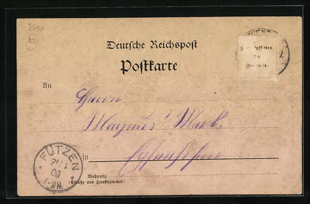 alte Ansichtskarte, gelaufen 1900, Briefmarke entfernt, rückseitig Oberflächenschaden, guter Zustand