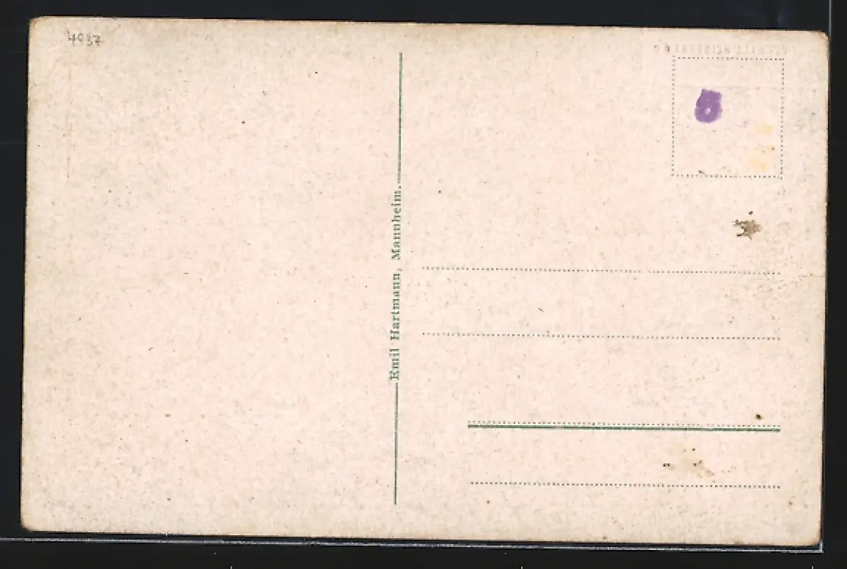 Personenbezogene Daten auf der Rückseite der Karte wurden durch blauen Textmarker unkenntlich gemacht. Die blauen Stellen sind auf die Vorderseite durchgeweicht und wirken sich negativ auf das Postkartenfoto aus