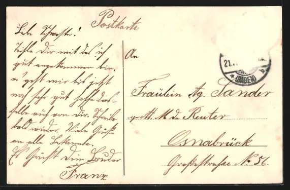 alte Ansichtskarte, gelaufen, Briefmarke entfernt, rückseitig Oberflächenschaden, guter Zustand