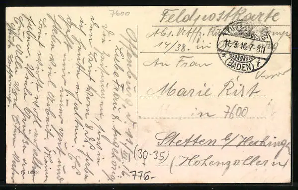 gelaufen 1916 als Feldpost, guter Zustand