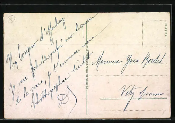 Personenbezogene Daten auf der Rückseite der Karte wurden durch blauen Textmarker unkenntlich gemacht. Die blauen Stellen sind auf die Vorderseite durchgeweicht und wirken sich negativ auf das Postkartenfoto aus