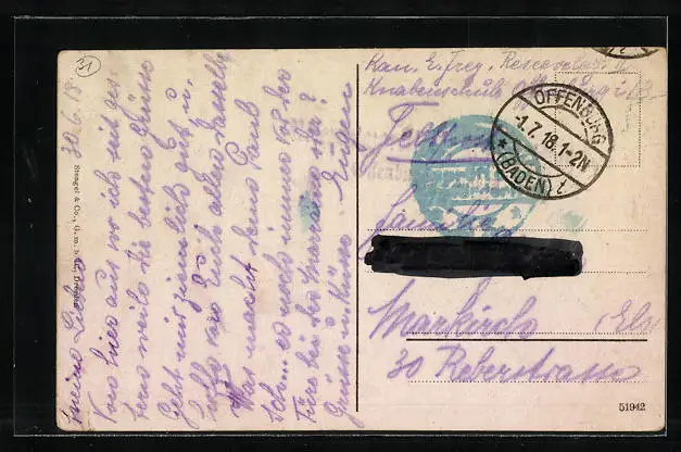 Personenbezogene Daten auf der Rückseite der Karte wurden durch blauen Textmarker unkenntlich gemacht. Die blauen Stellen sind auf die Vorderseite durchgeweicht und wirken sich negativ auf das Postkartenfoto aus