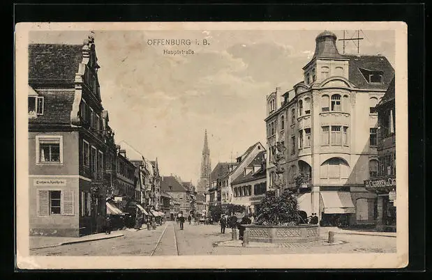 AK Offenburg i. B., Hauptstrasse mit Geschäften, Kirchturm und Brunnen