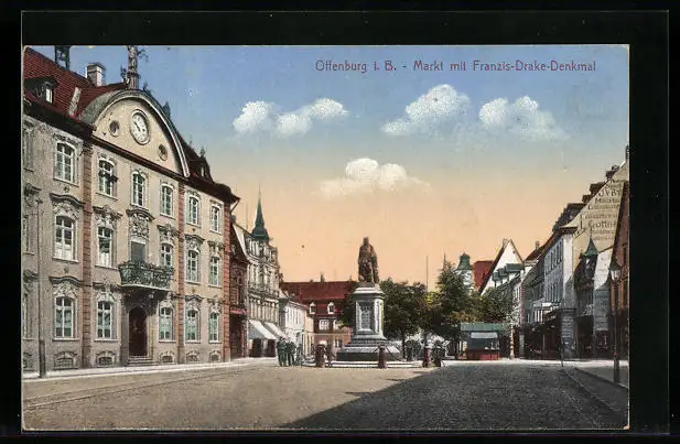 AK Offenburg i. B., Markt mit Franzis-Drake-Denkmal