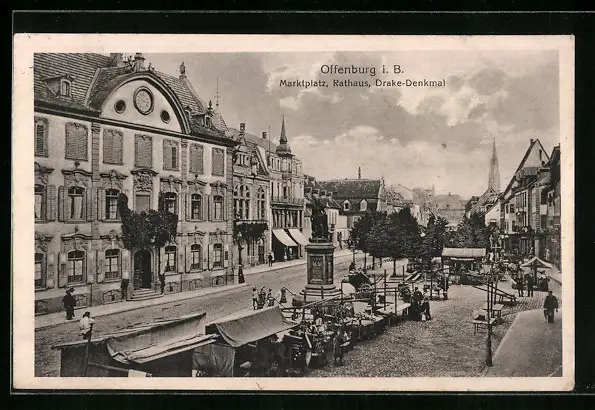 AK Offenburg i. B., Marktplatz mit Rathaus und Drake-Denkmal