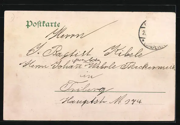 Personenbezogene Daten auf der Rückseite der Karte wurden durch blauen Textmarker unkenntlich gemacht. Die blauen Stellen sind auf die Vorderseite durchgeweicht und wirken sich negativ auf das Postkartenfoto aus
